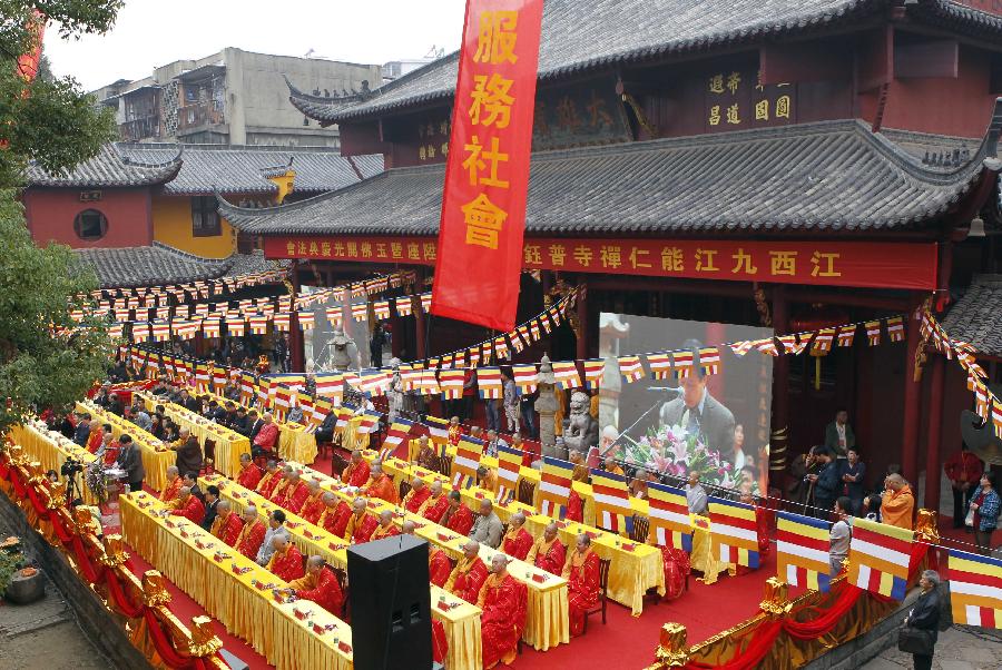 A consecration ceremony is held in the Nengren Zen Temple in Jiujiang, east China's Jiangxi Province, Oct. 19, 2013. Established some 1,500 years ago, the temple features intact Buddhism palaces, zen houses and other relics, which make it the largest ancient architectural complex in the city. (Xinhua/Xue Dongmei)