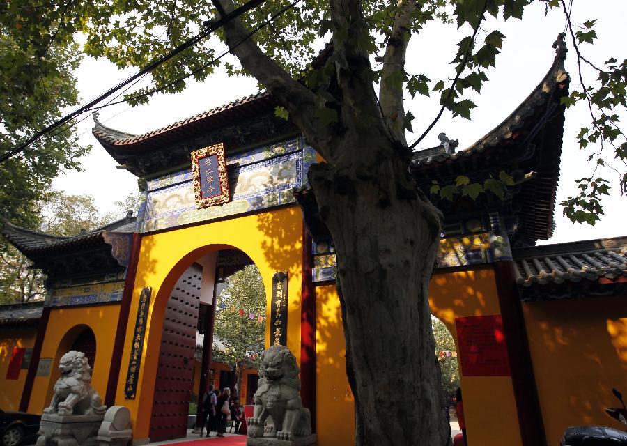 Photo taken on Oct. 18, 2013 shows a gate of the Nengren Zen Temple in Jiujiang, east China's Jiangxi Province. Established some 1,500 years ago, the temple features intact Buddhism palaces, zen houses and other relics, which make it the largest ancient architectural complex in the city. (Xinhua/Xue Dongmei) |