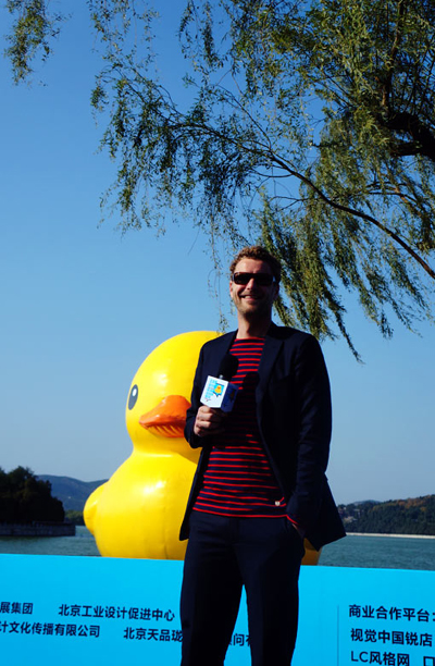Dutch artist Florentijn Hofman attends a farewell ceremony held for his inflatable Rubber Duck in Beijing, Oct. 24, 2013. The 18-meter-tall yellow Rubber Duck is going to end its Beijing show at the Summer Palace on Oct. 27. (People’s Daily Online/Chen Lidan)