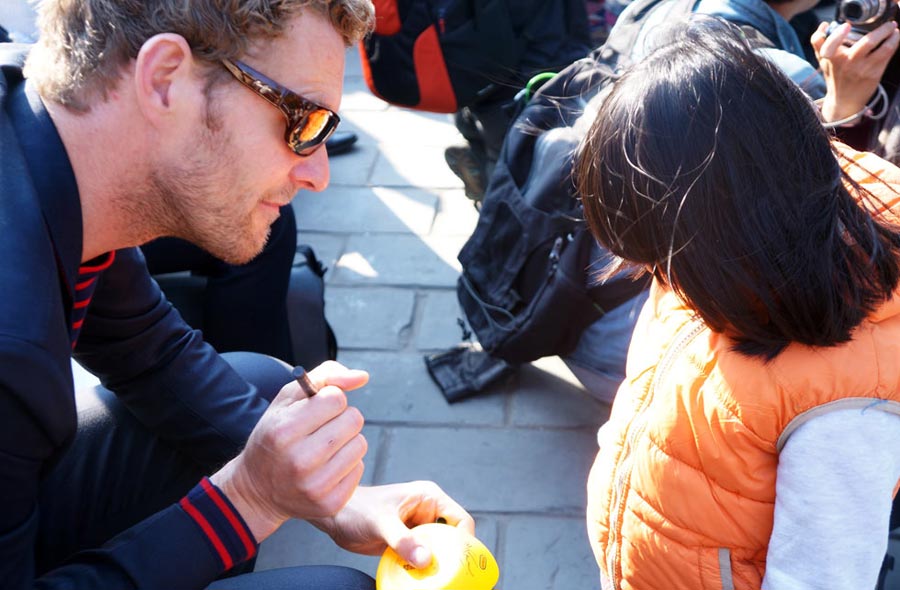 Dutch artist Florentijn Hofman gives a little rubber duck toy to a girl after leaving autograph in a farewell ceremony held for his inflatable Rubber Duck in Beijing, Oct. 24, 2013. The 18-meter-tall yellow Rubber Duck is going to end its Beijing show at the Summer Palace on Oct. 27. (People’s Daily Online/Chen Lidan)