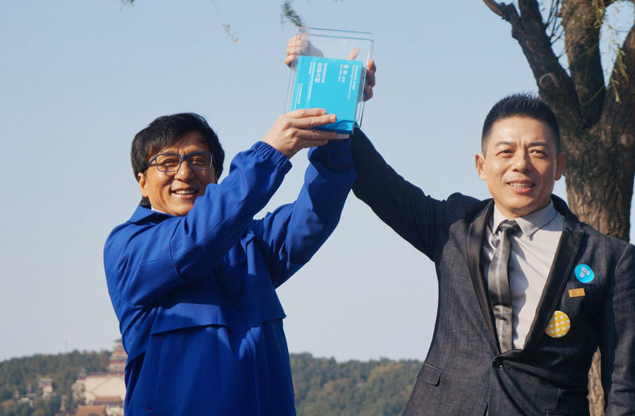 Jakie Chan accepts the appointment as “Ambassador of Public Service” for Beijing Design Week in a farewell ceremony held for Dutch artist Florentijn Hofman’s inflatable Rubber Duck in Beijing, Oct. 24, 2013. The 18-meter-tall yellow Rubber Duck is going to end its Beijing show in the Summer Palace on Oct. 27. (People’s Daily Online/Chen Lidan)
