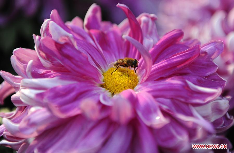 A bee lands on a chrysanthemum blossom at the 30th Wuhan Chrysanthemum Exhibition in Wuhan, capital of central China's Hubei Province, Oct. 26, 2013. The exhibition kicked off on Saturday, presenting over 3,000 different styles of chrysanthemum flowers.[Photo/Xinhua/Hao Tongqian]