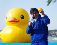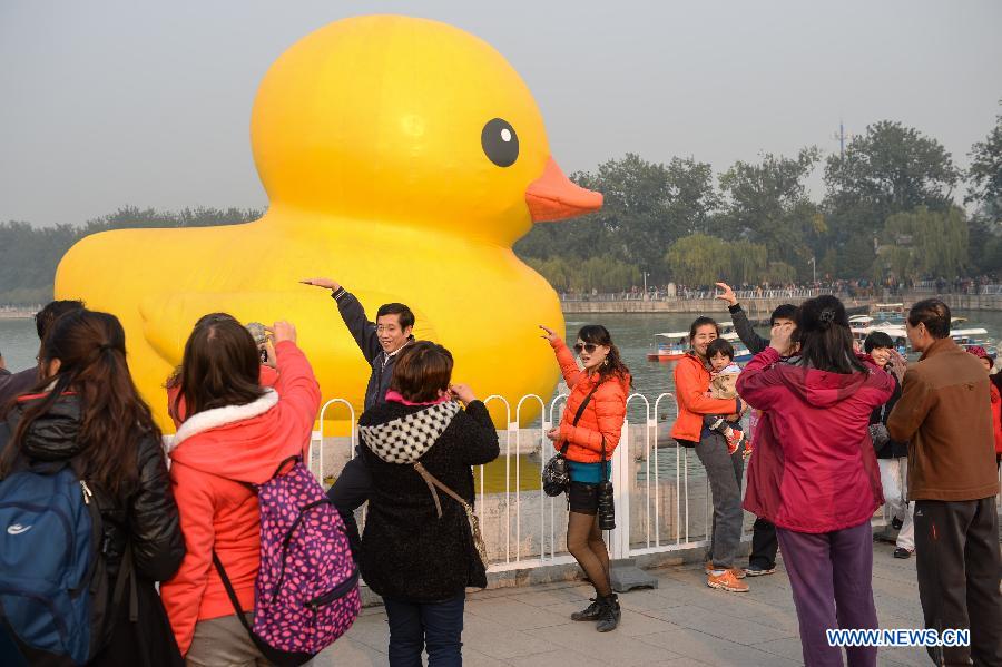 Visitors take pictures of "touching" the giant yellow rubber duck, brainchild of Dutch artist Florentijn Hofman, in the Summer Palace of Beijing, capital of China, Oct. 27, 2013. Sunday is the last day of the duck's tour in Beijing. (Xinhua/Li Xin)