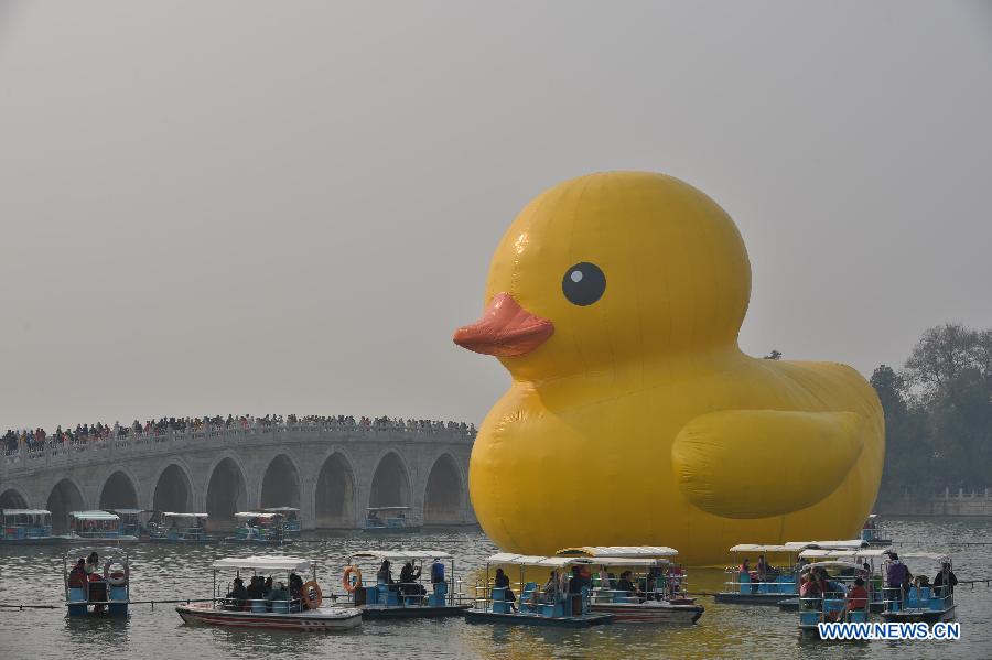 People come to the Summer Palace to see the giant yellow rubber duck, brainchild of Dutch artist Florentijn Hofman, in Beijing, capital of China, Oct. 27, 2013. Sunday is the last day of the duck's tour in Beijing. (Xinhua/Li Xin)
