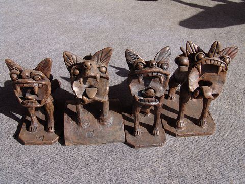 During this time, the koradji catches a red rooster, whispers some incantations related to the elimination of disasters, good luck, ghost removal and fortune-making, and then bites the cockscomb and sheds its blood on the eyes, nose, mouth, ears and entire body of the Tile Cat before putting five kinds of fruits and seeds (pine nut, melon seeds, broomcorn, Chinese date, and root) into the mouth of the Title Cat while burning a yellow sacrificial paper and whispering more incantations, and then finally killing the rooster. Later on, the Tile Cat is passed around and touched by the whole family, who stand witness during the whole process while the roof is being covered with tiles, until the Tile Cat is placed firmly and forever in the middle of the home’s ridge.