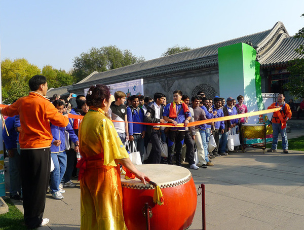 As drummers signal the start of the walk, participants line up to start the ramble around Kunming Lake on Oct. 26. (Photo: China.org.cn)