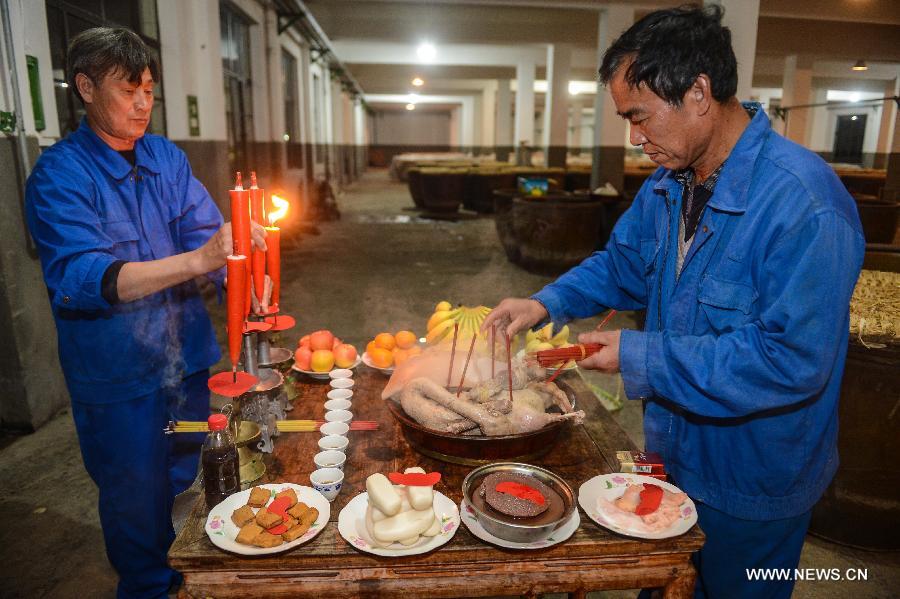Brewers observe a traditional rite honoring the wine god before the annual winter brewing at the Shenyonghe Brewery in Shaoxing, east China's Zhejiang Province, Oct. 27, 2013. With a history of more than 2,500 years, Shaoxing wine is one of the most famous varieties of Huangjiu, or Chinese yellow wine, fermented from rice. Shaoxing wine is still produced by locals nowadays with traditional method of brewing, which was included in the national intangible cultural heritage list in 2006. (Xinhua/Xu Yu)
