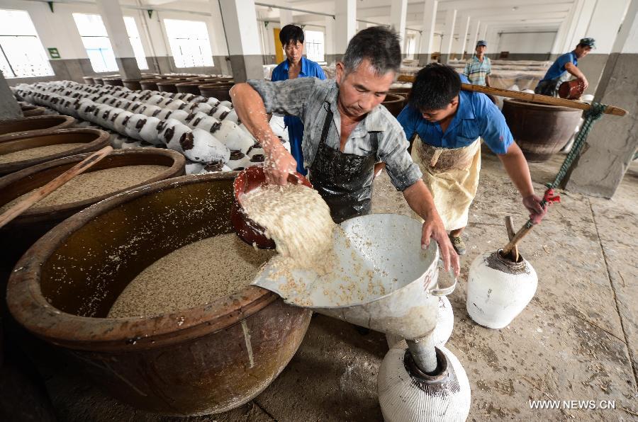 Brewers fill ceramic containers with fermented glutinous rice during the annual winter brewing at the Shenyonghe Brewery in Shaoxing, east China's Zhejiang Province, Oct. 30, 2013. With a history of more than 2,500 years, Shaoxing wine is one of the most famous varieties of Huangjiu, or Chinese yellow wine, fermented from rice. Shaoxing wine is still produced by locals nowadays with traditional method of brewing, which was included in the national intangible cultural heritage list in 2006. (Xinhua/Xu Yu)
