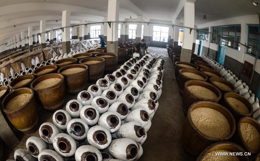 Ceramic containers for the annual winter brewing are seen at the Shenyonghe Brewery in Shaoxing, east China's Zhejiang Province, Oct. 30, 2013. With a history of more than 2,500 years, Shaoxing wine is one of the most famous varieties of Huangjiu, or Chinese yellow wine, fermented from rice. Shaoxing wine is still produced by locals nowadays with traditional method of brewing, which was included in the national intangible cultural heritage list in 2006. (Xinhua/Xu Yu)
