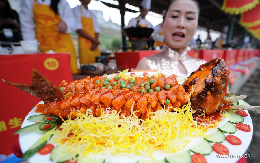 A worker displays the dish of sweet and sour fish at a fish cooking contest held in Wan'an County, east China's Jiangxi Province, Oct. 30, 2013. The second fish cooking contest was held in Wan'an County on Wednesday. With abundant lake resources, the county has endeavored to develop its fishery industry recently. (Xinhua/Zhou Ke) |