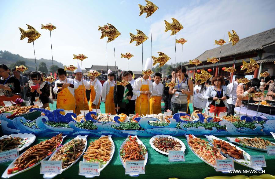 Contestants introduce their dishes at a fish cooking contest held in Wan'an County, east China's Jiangxi Province, Oct. 30, 2013. The second fish cooking contest was held in Wan'an County on Wednesday. With abundant lake resources, the county has endeavored to develop its fishery industry recently. (Xinhua/Zhou Ke) |