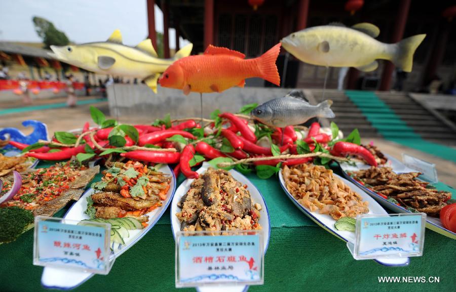 Photo taken on Oct. 30, 2013 shows various dishes at a fish cooking contest held in Wan'an County, east China's Jiangxi Province. The second fish cooking contest was held in Wan'an County on Wednesday. With abundant lake resources, the county has endeavored to develop its fishery industry recently. (Xinhua/Zhou Ke) |