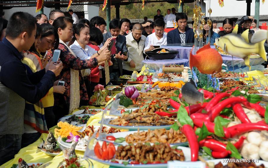 People view the all fish banquet at a fish cooking contest held in Wan'an County, east China's Jiangxi Province, Oct. 30, 2013. The second fish cooking contest was held in Wan'an County on Wednesday. With abundant lake resources, the county has endeavored to develop its fishery industry recently. (Xinhua/Zhou Ke) |
