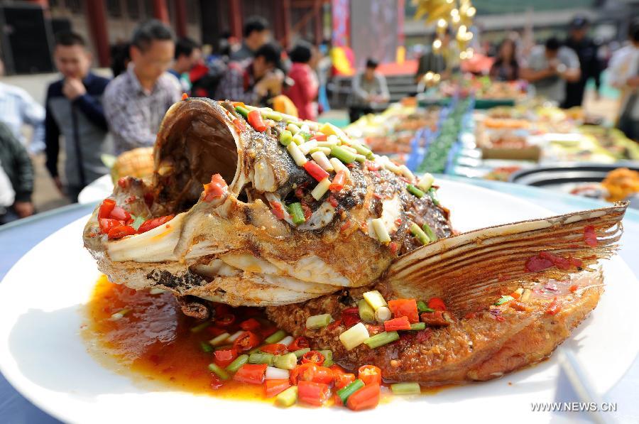 Photo taken on Oct. 30, 2013 shows a giant fish head dish at a fish cooking contest held in Wan'an County, east China's Jiangxi Province. The second fish cooking contest was held in Wan'an County on Wednesday. With abundant lake resources, the county has endeavored to develop its fishery industry recently. (Xinhua/Zhou Ke) |