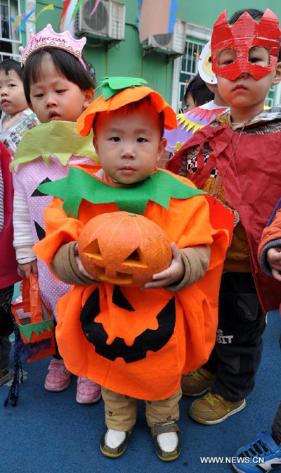 Children show costumes they made to greet the Halloween in a kindergarten in Handan City, north China's Hebei Province, Oct. 31. The World Thrift Day fell on Thursday, a day before the All-Saint's Day this year. (Xinhua/Hao Qunying)