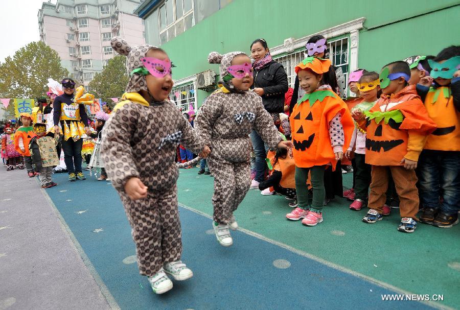 A pair of twins show costumes made with recycled materials to greet the Halloween in a kindergarten in Handan City, north China's Hebei Province, Oct. 31. The World Thrift Day fell on Thursday, a day before the All-Saint's Day this year. (Xinhua/Hao Qunying)