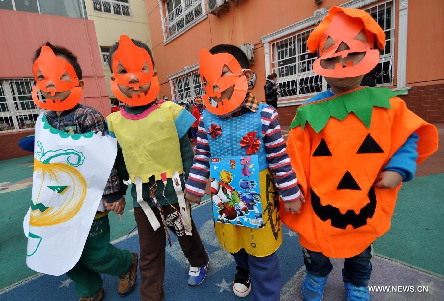 Children show costumes made with recycled materials to greet the Halloween in a kindergarten in Handan City, north China's Hebei Province, Oct. 31. The World Thrift Day fell on Thursday, a day before the All-Saint's Day this year. (Xinhua/Hao Qunying)
