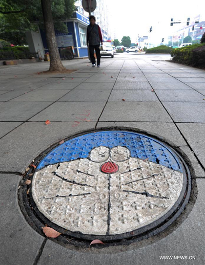 Photo taken on Oct. 31, 2013 shows a graffito on a manhole cover at the Xingsha Square in Changsha, capital of central China's Hunan Province. (Xinhua/Li Ga)