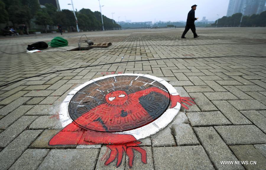 Photo taken on Oct. 31, 2013 shows a graffito on a manhole cover at the Xingsha Square in Changsha, capital of central China's Hunan Province. (Xinhua/Li Ga)