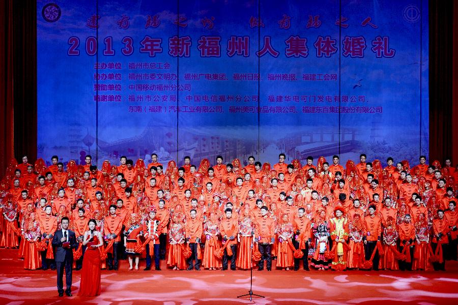 A total of 100 couples who are migrant workers attend a group wedding ceremony in Fuzhou, capital of southeast China's Fujian Province, Nov. 3, 2013. (Xinhua/Zhang Guojun)
