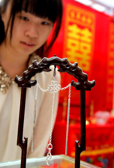 A girl views a pair of silver chopsticks, an auspicious gift for the newlywed, at a chopsticks culture festival in Shanghai, east China, Nov. 2, 2013. A chopsticks store promoted the tradition and culture of chopsticks in Shanghai on Saturday. (Xinhua/Liu Ying)