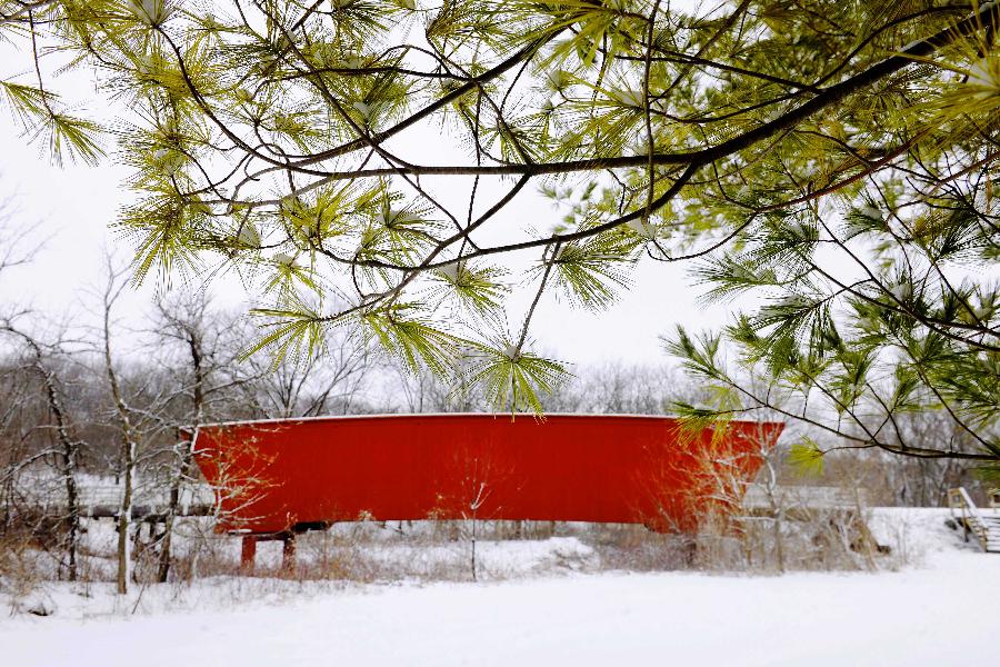 The Cedar Covered Bridge is covered with snow in Winterset, Iowa, the United States, Feb. 13, 2012. More than a decade after the movie "The Bridges of Madison County" was released, thousands of people still travel to Winterset each year to trace the steps where Clint Eastwood and Meryl Streep immortalized the area's covered bridges. [Photo: Xinhua/Shen Hong]