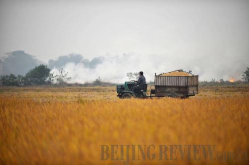 GOLDEN FIELDS: A farmer transports newly harvested rice on October 28 in Wangcheng District, Changsha, Hunan Province (XINHUA)