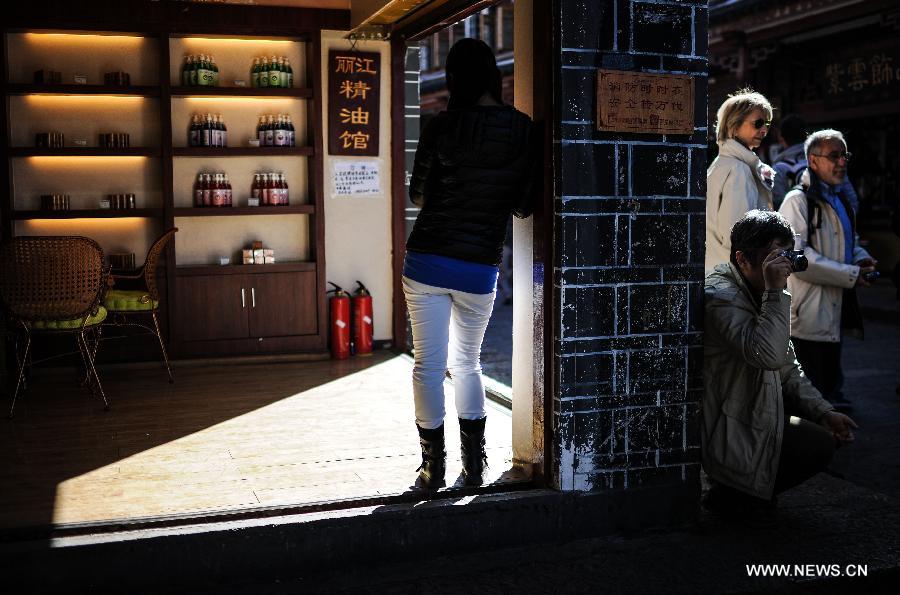 A tourist takes photos by a store in the old town of Lijiang, southwest China's Yunnan Province, Nov. 5, 2013. (Xinhua/Shen Hong)
