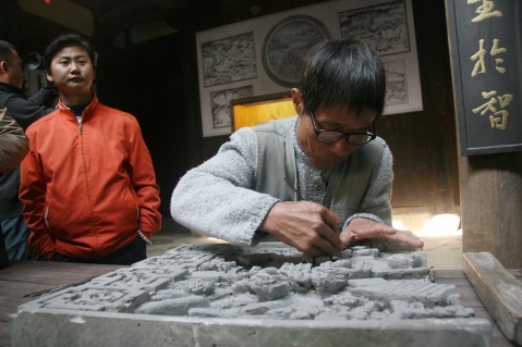 When used for decoration in an arch, a Huizhou-style brick carving is usually an ensemble of several parts done on 40-centimeter square bricks. In 1988, a client commissioned a four-square-meter Huangshan Mountain Scene as a garden decoration. For visual effect, the customer suggested using bigger bricks. So for the first time Fang selected gray bricks of 70 cm by 40 cm.