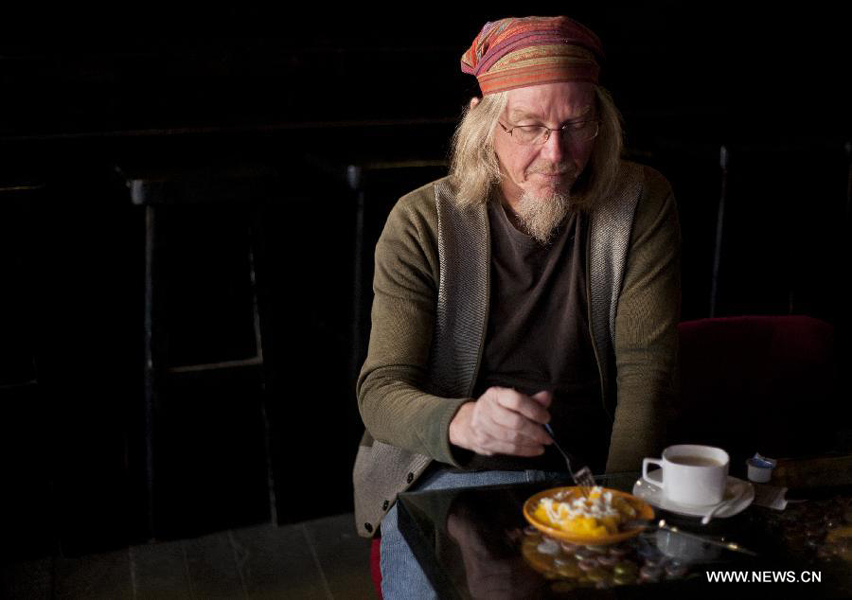 Ken has afternoon tea at a cafe in the old town of Lijiang, southwest China's Yunnan Province, Nov. 8, 2013. Ken Nilsen, a 57-year-old Norway-born Canadian, is a famous person in the old town of Lijiang. Despite his foreign-look appearance, he lived a life of Chinese style. During the daytime, he usually stays at his yard which is of traditional Naxi style, doing some drawing and writing. Sometimes, he rides his electric mobile of a Chinese brand to the town, drinking coffee and chatting with friends. At night, he plays guitar at bar and performs his original songs. He used to be an architect before retirement. But now he is more like a versatile artist, publishing illustrated books and making his own records. Among the many places he has travelled around the world, only this small town of Lijiang won over his heart. "Staying in Lijiang makes me feel at peace," Ken said. He has lived in Lijiang for over five years and planned to continue such life. (Xinhua/Ma Ping)