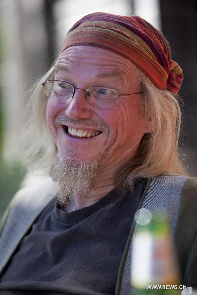 Ken waits for his friend by a restaurant in the old town of Lijiang, southwest China's Yunnan Province, Nov. 8, 2013. Ken Nilsen, a 57-year-old Norway-born Canadian, is a famous person in the old town of Lijiang. Despite his foreign-look appearance, he lived a life of Chinese style. During the daytime, he usually stays at his yard which is of traditional Naxi style, doing some drawing and writing. Sometimes, he rides his electric mobile of a Chinese brand to the town, drinking coffee and chatting with friends. At night, he plays guitar at bar and performs his original songs. He used to be an architect before retirement. But now he is more like a versatile artist, publishing illustrated books and making his own records. Among the many places he has travelled around the world, only this small town of Lijiang won over his heart. "Staying in Lijiang makes me feel at peace," Ken said. He has lived in Lijiang for over five years and planned to continue such life. (Xinhua/Ma Ping)