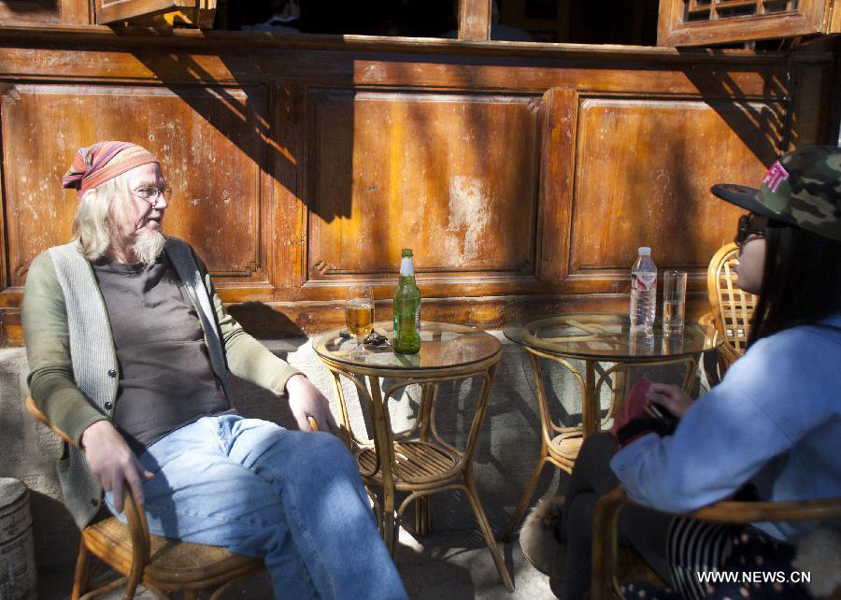 Ken talks with a friend outside a restaurant in the old town of Lijiang, southwest China's Yunnan Province, Nov. 8, 2013. He has a lot of friends here and they always hang out together. Ken Nilsen, a 57-year-old Norway-born Canadian, is a famous person in the old town of Lijiang. Despite his foreign-look appearance, he lived a life of Chinese style. During the daytime, he usually stays at his yard which is of traditional Naxi style, doing some drawing and writing. Sometimes, he rides his electric mobile of a Chinese brand to the town, drinking coffee and chatting with friends. At night, he plays guitar at bar and performs his original songs. He used to be an architect before retirement. But now he is more like a versatile artist, publishing illustrated books and making his own records. Among the many places he has travelled around the world, only this small town of Lijiang won over his heart. "Staying in Lijiang makes me feel at peace," Ken said. He has lived in Lijiang for over five years and planned to continue such life. (Xinhua/Ma Ping)
