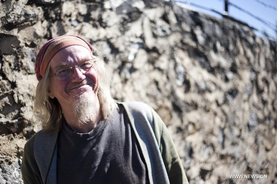 Ken stands by an alley outside his yard in the old town of Lijiang, southwest China's Yunnan Province, Nov. 8, 2013. Ken Nilsen, a 57-year-old Norway-born Canadian, is a famous person in the old town of Lijiang. Despite his foreign-look appearance, he lived a life of Chinese style. During the daytime, he usually stays at his yard which is of traditional Naxi style, doing some drawing and writing. Sometimes, he rides his electric mobile of a Chinese brand to the town, drinking coffee and chatting with friends. At night, he plays guitar at bar and performs his original songs. He used to be an architect before retirement. But now he is more like a versatile artist, publishing illustrated books and making his own records. Among the many places he has travelled around the world, only this small town of Lijiang won over his heart. "Staying in Lijiang makes me feel at peace," Ken said. He has lived in Lijiang for over five years and planned to continue such life. (Xinhua/Ma Ping)