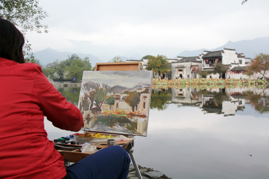 A young artist captures the beauty of Hongcun Village and the surrounding body of water, in Yi County, Anhui province, as the mist rolls over the peaks in the distance. [Photo: CRIENGLISH.com/Stuart Wiggin]