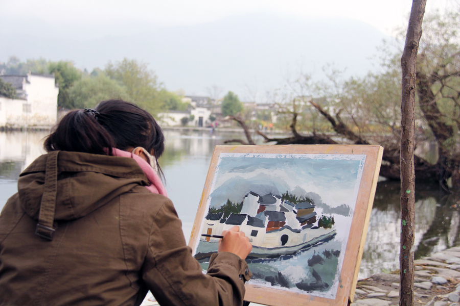 A young artist sits alongside the water at Hongcun village in Yi County, Anhui province, to capture the picture perfect setting in water colors. [Photo: CRIENGLISH.com/Stuart Wiggin]