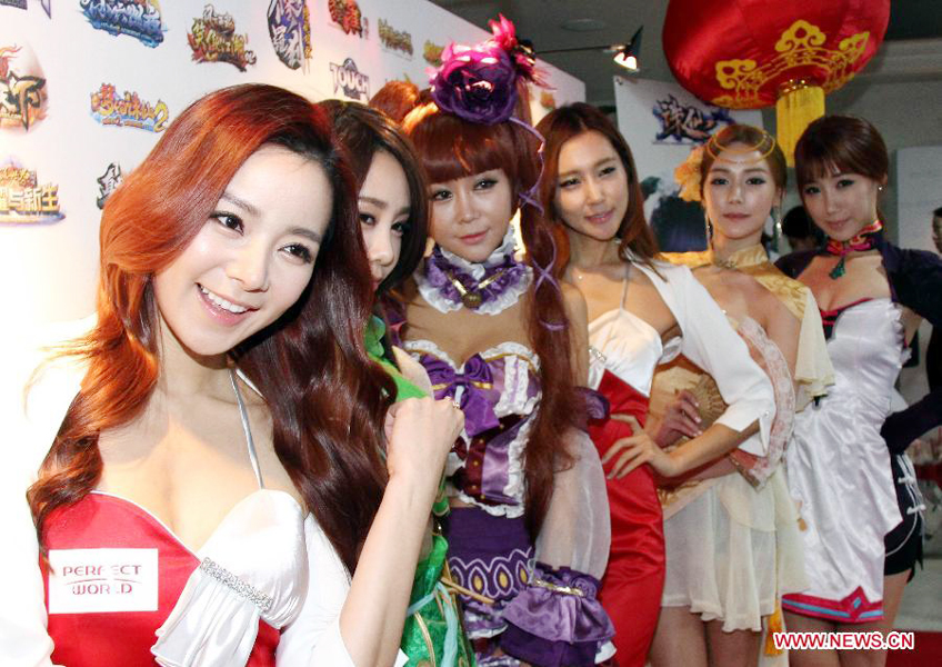 Cosplay models pose for photos during the press conference about the global expansion strategy of Chinese game developer Perfect World, in Seoul, South Korea, Nov. 19, 2013. Perfect World, a major online game developer and operator in China, unveiled its global investment and partnership strategy to raise its global market share in Seoul Tuesday. (Xinhua/Huang Heng)