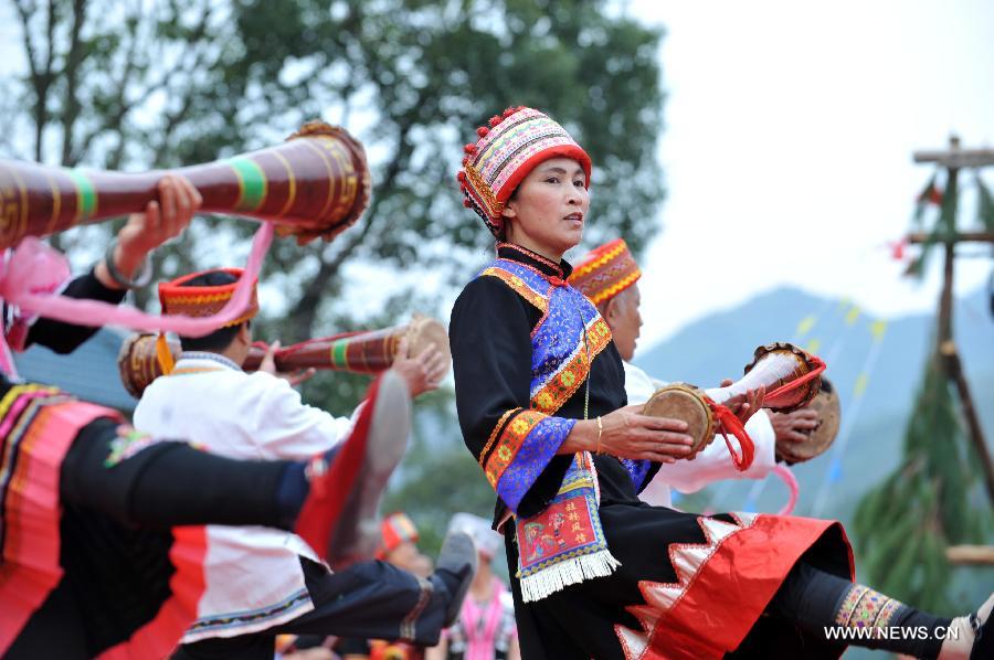 Villagers dance to celebrate the Panwang Festival at Shuibin Village in Gongcheng Yao Autonomous Prefecture, south China's Guangxi Zhuang Autonomous Region, Nov. 18, 2013. The Panwang Festival is celebrated by the people of the Yao ethnic group on the 16th day of the 10th month of the Chinese lunar calendar to worship their mythological ancestor Pan Hu. (Xinhua/Zhou Hua)