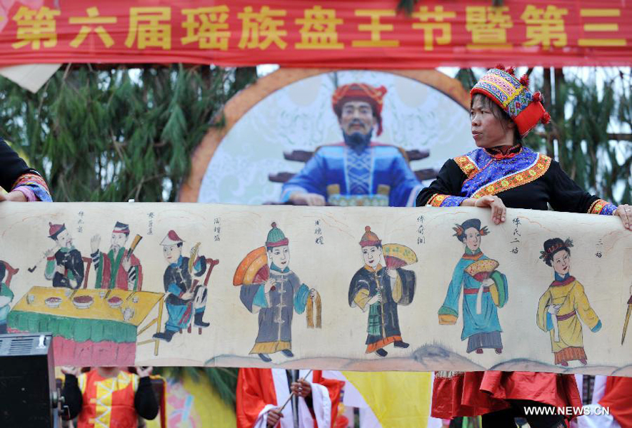 Villagers dance to celebrate the Panwang Festival at Shuibin Village in Gongcheng Yao Autonomous Prefecture, south China's Guangxi Zhuang Autonomous Region, Nov. 18, 2013. The Panwang Festival is celebrated by the people of the Yao ethnic group on the 16th day of the 10th month of the Chinese lunar calendar to worship their mythological ancestor Pan Hu. (Xinhua/Zhou Hua)