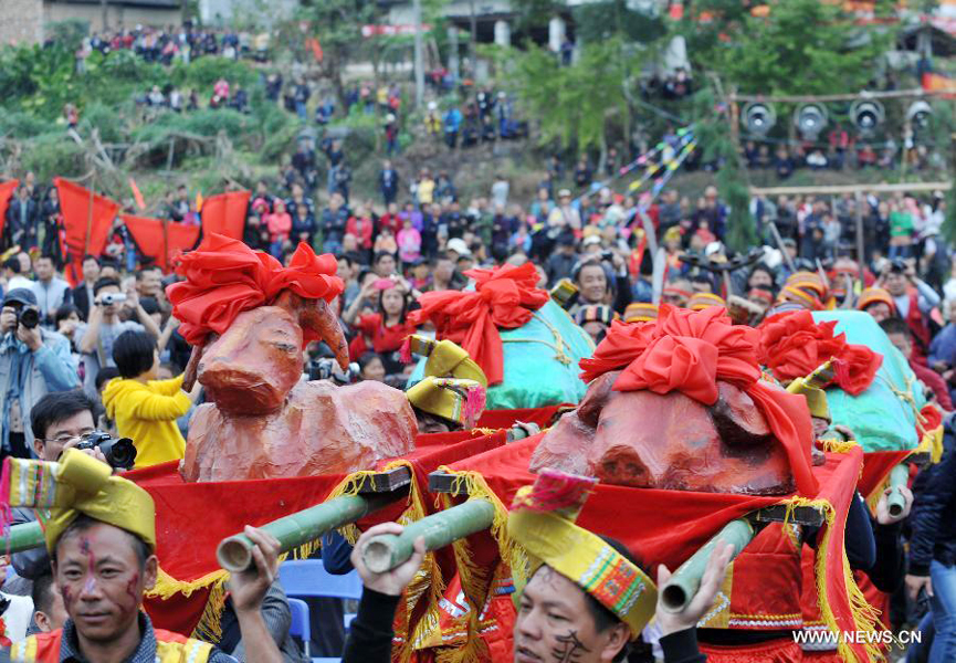 Villagers celebrate the Panwang Festival at Shuibin Village in Gongcheng Yao Autonomous Prefecture, south China's Guangxi Zhuang Autonomous Region, Nov. 18, 2013. The Panwang Festival is celebrated by the people of the Yao ethnic group on the 16th day of the 10th month of the Chinese lunar calendar to worship their mythological ancestor Pan Hu. (Xinhua/Zhou Hua)