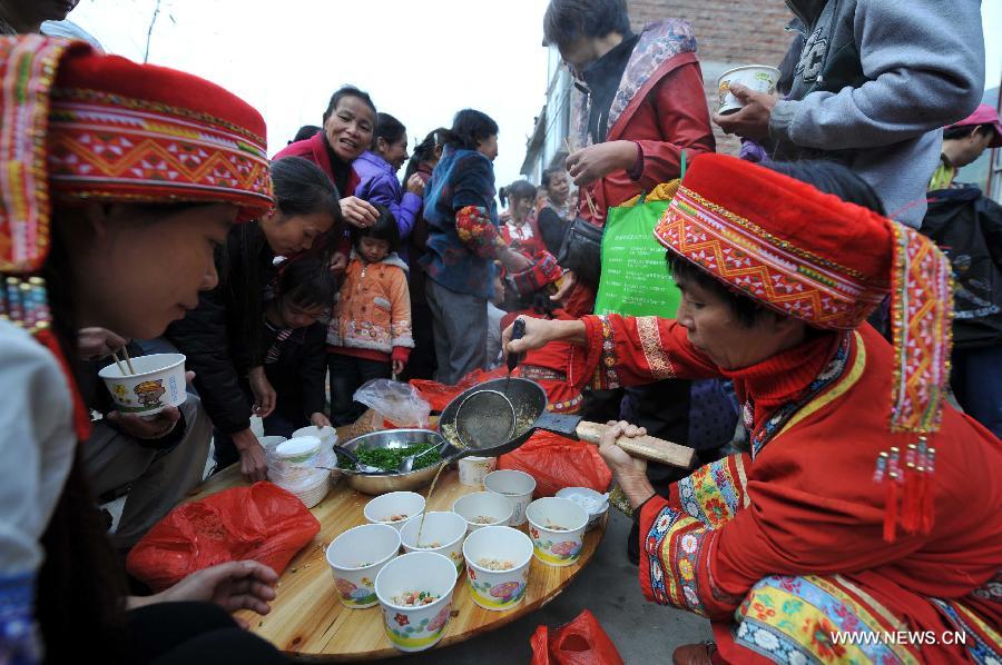 Villagers treat guests at Shuibin Village in Gongcheng Yao Autonomous Prefecture, south China's Guangxi Zhuang Autonomous Region, Nov. 18, 2013. The Panwang Festival is celebrated by the people of the Yao ethnic group on the 16th day of the 10th month of the Chinese lunar calendar to worship their mythological ancestor Pan Hu. (Xinhua/Zhou Hua)