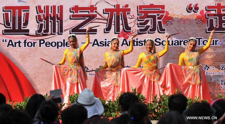 Performers from Singapore dance during the 13th Asia Art Festival in Kunming, capital of southwest China's Yunnan Province, Nov. 20, 2013. Artists from 11 Asian countries performed in communities and parks in Kunming on Wednesday, providing stunning shows for locals. (Xinhua/Lin Yiguang)