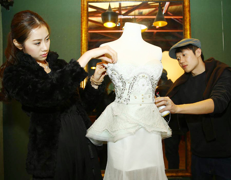 Chinese supermodel Chen Lu (L) works in her studio in Shanghai on November 19, 2013. Chen, who started modeling at the tender age of 16, is now a designer for Movous, a local brand specialized in wedding dresses. Chen is married to Chinese bastketball superstar Sun Yue. [Photo/Xinhua]