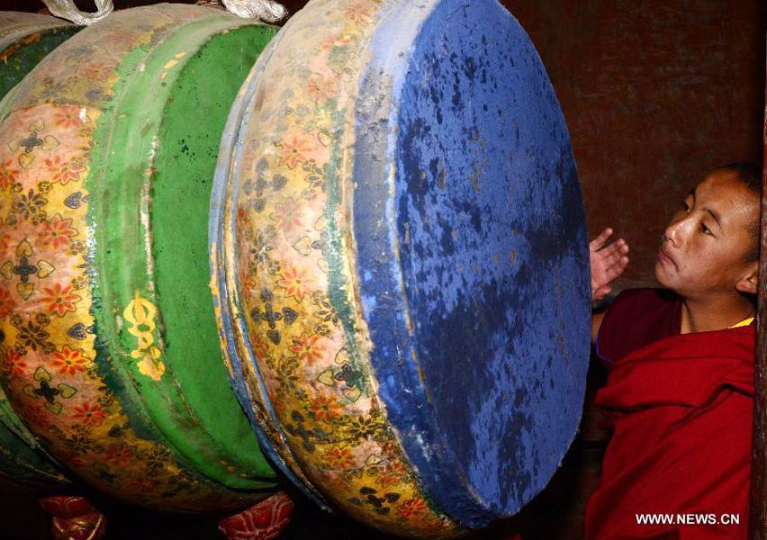 Young monk Soinam Gyaco arranges a drum at the Gonggar Qoide Monastery in Gonggar County of southwest China's Tibet Autonomous Region, Nov. 20, 2013. (Xinhua/Chogo)