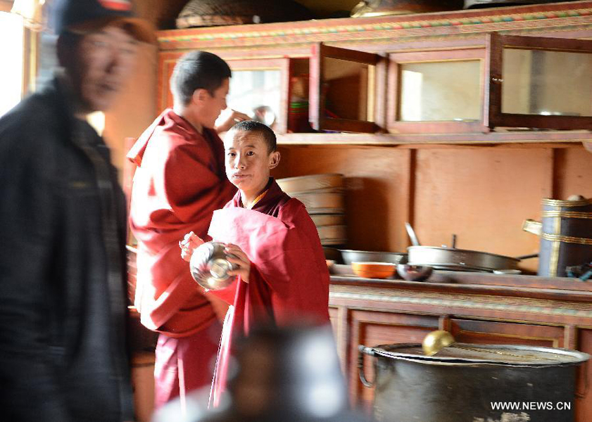Young monk Soinam Gyaco (R) waits for lunch at the dinning hall of the Gonggar Qoide Monastery in Gonggar County of southwest China's Tibet Autonomous Region, Nov. 20, 2013.(Xinhua/Chogo)