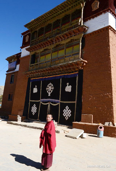 Young monk Soinam Gyaco stands in front of the Gonggar Qoide Monastery in Gonggar County of southwest China's Tibet Autonomous Region, Nov. 20, 2013. (Xinhua/Chogo)