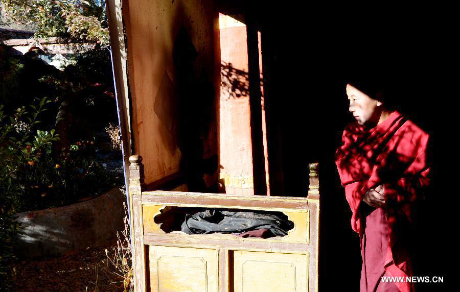 Young monk Soinam Gyaco is seen at the Gonggar Qoide Monastery in Gonggar County of southwest China's Tibet Autonomous Region, Nov. 20, 2013. (Xinhua/Chogo)