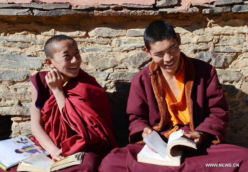 Young monk Soinam Gyaco (L) studies with his friend under the sun at the Gonggar Qoide Monastery in Gonggar County of southwest China's Tibet Autonomous Region, Nov. 20, 2013.(Xinhua/Chogo)