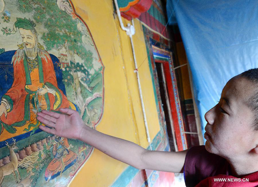 Young monk Soinam Gyaco introduces a painting to a visitor at the Gonggar Qoide Monastery in Gonggar County of southwest China's Tibet Autonomous Region, Nov. 20, 2013. (Xinhua/Chogo)