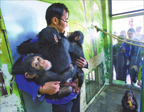 African chimpanzees with their keeper in Shanghai Wild Animal Park.