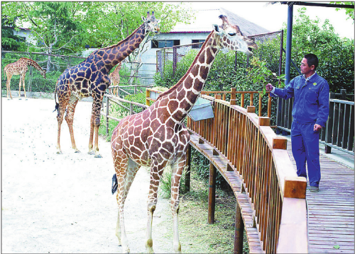 The giraffes' neighbors, the hippos, on the other hand, are much tougher, making them easier to take care of, although they only moved into the park, in Pudong New Area, about 35 kilometers from the city center, a couple of months ago.